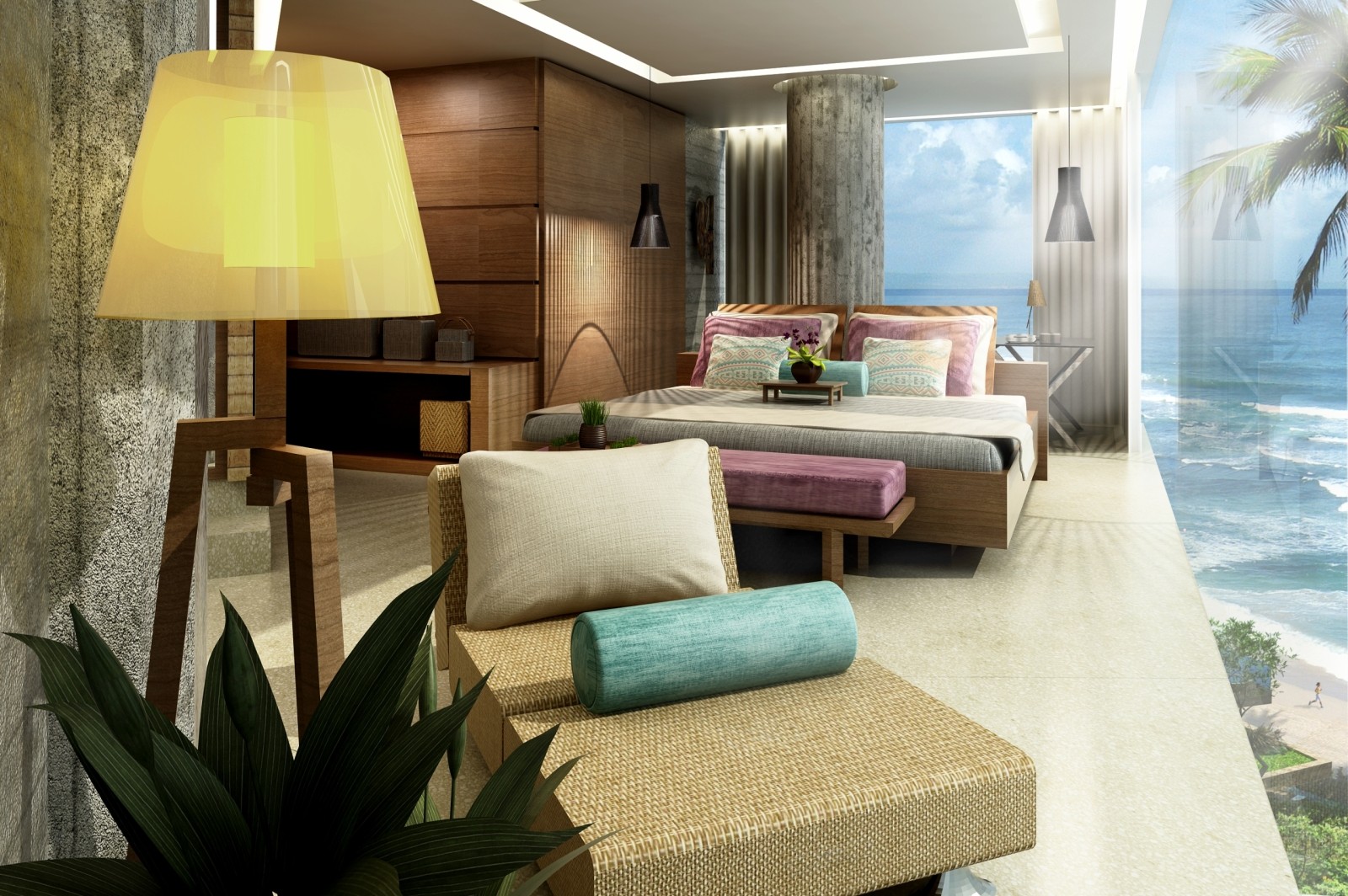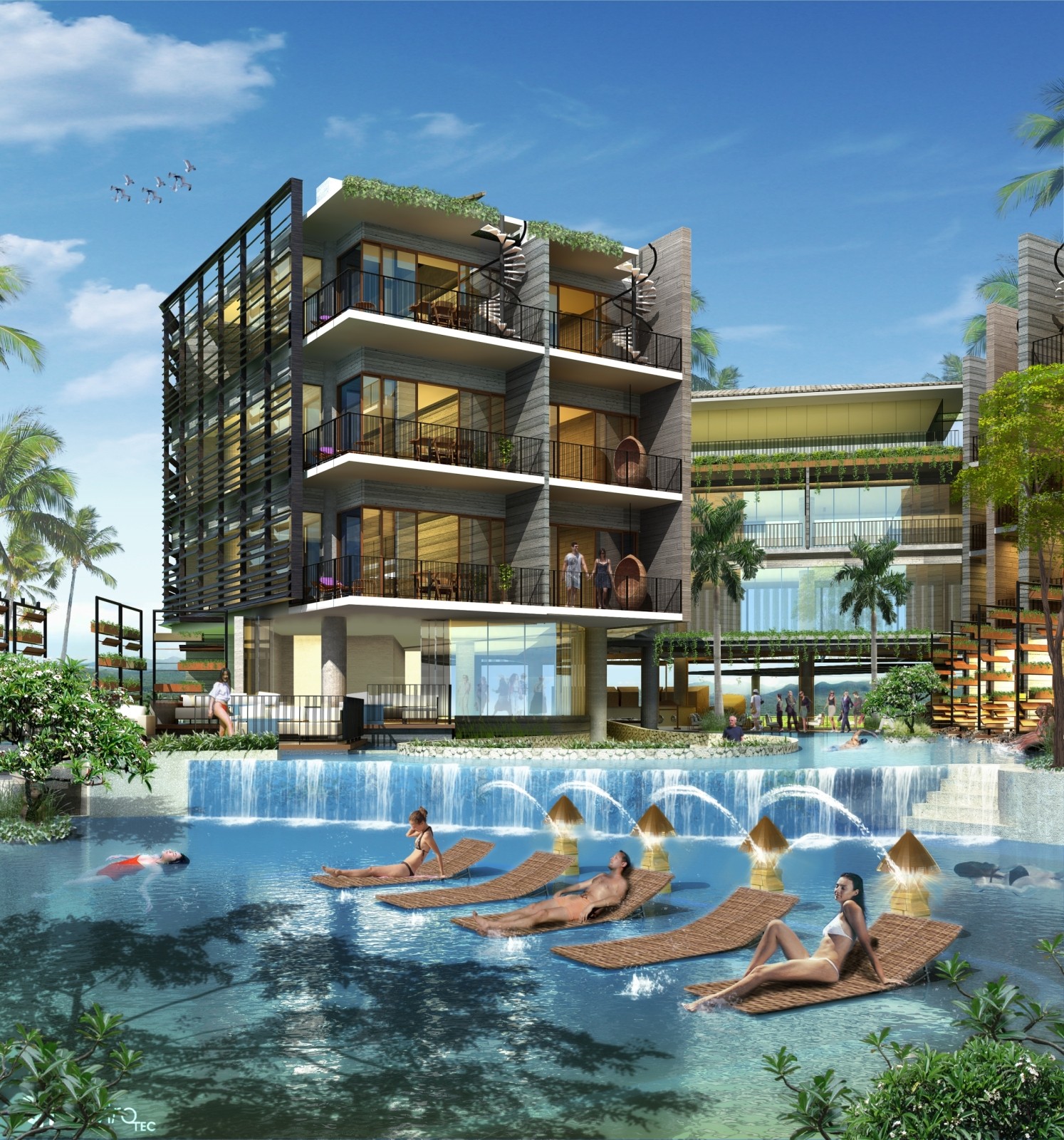 Alorie Azure De Pasir This is 6 stars boutique resort consists of 37 nos. of Residences / Condotel units for Strata Sale under the management of International hospitality group, The exclusive development is located on black crystal beach of Pasut with a direct beachfront access from the beach Restaurant. The main thematic design idea is of a U-shaped wing building with each room having a complete sea view which perched on a open naturally ventilated hotel lobby and its “rock formations”. As Pasut is well known as a black rocky beach, the building takes landscape references from its surrounding. The lagoon terraced pool becomes the main cooling element during hot Balinese afternoons where private dwellers can submerge oneself in complete silence and enjoying the infinity pool.
